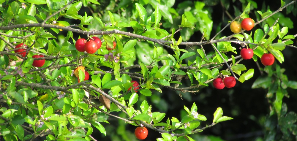 ACEROLA — Arbusto originário das Antilhas (ilhas no Mar do Caribe na América Central). Pertence à família das malpighiáceas. Pode atingir até três metros de altura. O tronco se ramifica desde a base. A copa é bastante densa. As folhas são verde-escuras e brilhantes. As flores de cor rósea-esbranquiçada são dispostas em cachos. Têm floração durante todo o ano. Após três ou quatro semanas, se dá a frutificação. Por ser uma planta muito rústica e resistente, a acerola se espalhou facilmente por várias áreas tropicais, subtropicais e até semiáridas. O fruto lembra a cereja. É riquíssimo em vitamina A e C, ferro e cálcio.