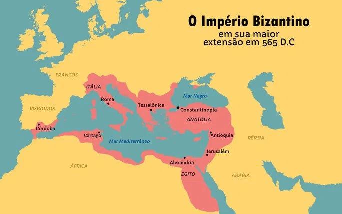 IMPÉRIO BIZANTINO — Originou-se da divisão do Império Romano no ano 395. Essa divisão separou a parte oriental da parte ocidental. Com capital em Constantinopla (atual Istambul na Turquia), a região sobreviveu à queda o Império Romano do Ocidente no ano 476. Floresceu por quase mil anos como uma síntese das culturas romana, grega e oriental. O império teve mais de oitenta imperadores entre os anos 395 a 1453. As principais dinastias foram a Justiniana (Justiniano 1.º), Heracliana (Heráclio), a Macedônica (Basílio 2.º) e a Paleóloga. O último imperador bizantino, o Constantino 11 Paleólpgo, governou entre os anos 1448 e 1453. Ele foi morto em batalha quando liderava as forças de Constantinopla contra a invasão dos otomanos.