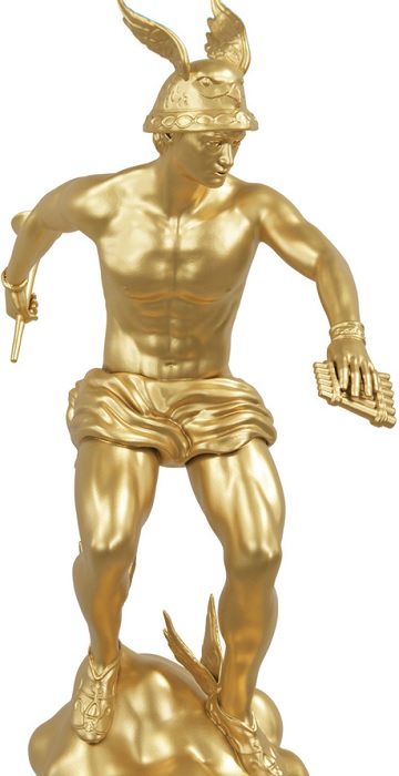 tornando-se pouco a pouco o deus dos viajantes. Em honra dele erguiam-se estátuas — as hermas — ao longo das estradas. Esses monumentos, que a princípio tinham apenas a função de indicar os rumos, acabaram por se transformar no símbolo do próprio deus. De protetor das estradas, o Hermes passou a deus do comércio e dos ladrões, invocado como propiciador de riquezas. Para proteger compradores e vendedores, inventou a balança. A personalidade mítica dele desenvolveu-se mais. Passou então a tutelar a eloquência, condição necessária à arte de comerciar. A desenvoltura com que realizava suas atividades o fez modelo ideal da juventude. Assim, era reverenciado também como patrono dos esportistas.