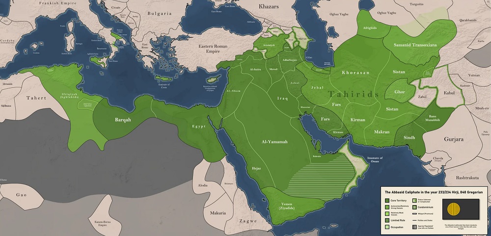 Sob os abássidas, a civilização islâmica atingiu o seu auge cultural e científico, especialmente durante o califado do Harun al-Rashid (786-809). Áreas como a medicina, a matemática, a astronomia e a filosofia floresceram. O império estendia-se do Magreb (norte da África) até a Pérsia (atual Irã) e o Rio Indo, incluindo o atual Afeganistão. A partir do Século 10, o califado começou a perder unidade política, com a fragmentação em dinastias locais. O governo abássida terminou oficialmente em 1258, quando Bagdá foi destruída pelos mongóis.